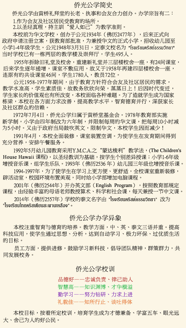 Thai Christian Sapan Luang School (TCSS) Chinese name called “Qiao Guang Gong Xue”, was established by a group of elders, deacons and members of Sapanluang Christian Church with objectives as follows: